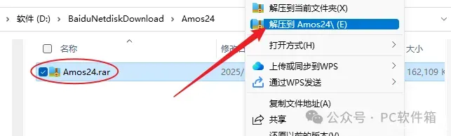 1.解压安装包:鼠标右击【Amos24】压缩包,选择电脑上安装的解压软件,点击解压到【Amos24】。