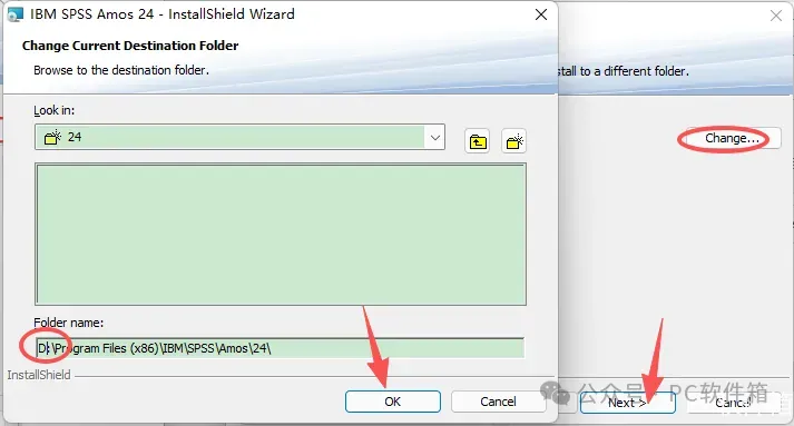 6.①点击【Change……】;②修改路径地址的C可更改安装位置(如:将C改为D);③点击【OK】。