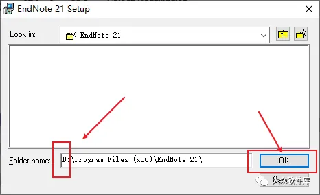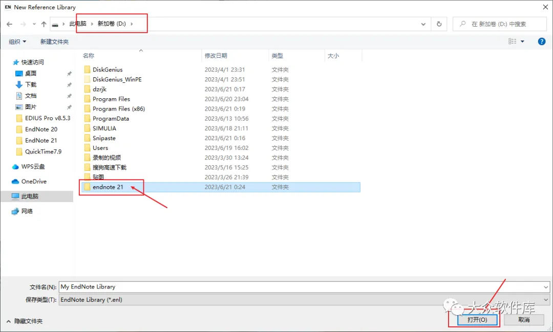 22.建议在D盘下新建一个名为endnote的文件夹,然后点击打开;(以后保存的文件都会存放在该位置)