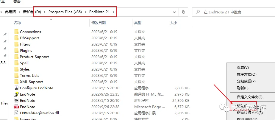 17.打开软件的安装位置(第十步位置,如果你跟我一样只修改磁盘符,就依次打开D:\Program Files (x86)\EndNote 20),在空白位置下点击粘贴;