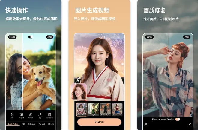 智能修复(Enhance):一键自动优化光效、色彩和锐度。小白救星,废片杀手。