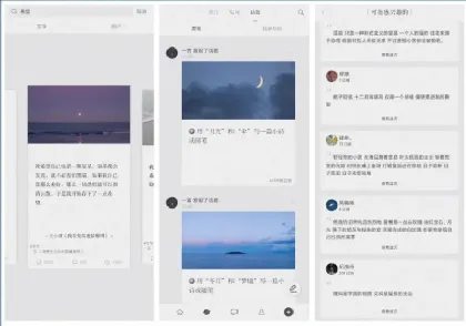 它的发现版块可以帮助你发现唯美句子,包括:文字、诗、语录等,话题版块可以查看某个话题下的所有句子,例如:用月光和伞写一篇小诗或随笔、用蓝色和夜写一篇小诗或随笔、写一首关于十二月的小诗。