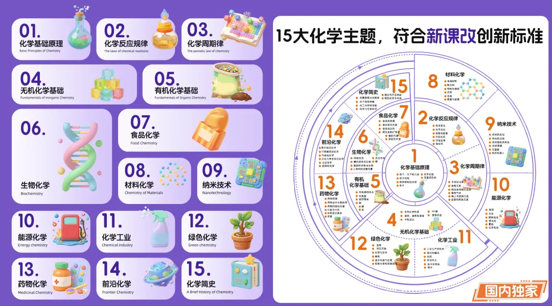 “化学十分通”构建了完整的化学启蒙体系,涵盖15大化学主题、1000+小初科学知识点,共计253集内容。