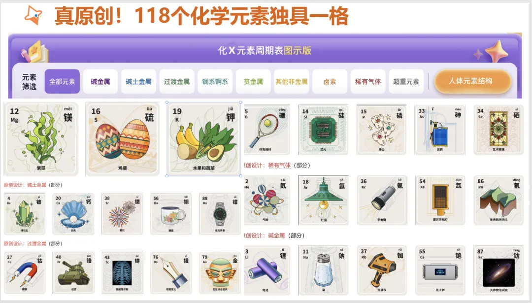 更是独创了有代表性生活场景的元素周期表,比如氟元素的形状就是牙刷,带孩子们把化学和生活紧密联系起来:
