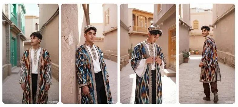 8K 画质,维吾尔族帅哥身着传统艾德莱斯绸元素的男士服饰,在喀什古城充满历史感的巷弄中,阳光透过建筑形成的侧光勾勒身形,专业人像摄影,展现服饰的质感与古城的韵味融合。要求:生成 4 张不同姿势、不同景别的高清图片,保持整体风格统一。细节呈现拉满,达到专业商业人像摄影级别,画面干净高级。