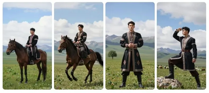 8K 画质,维吾尔族帅哥穿着具有民族特色的骑士盛装,在那拉提草原上,以蓝天白云和草原风光为背景,自然的漫射光突出服饰的硬朗线条,专业人像摄影,体现民族服饰与草原的豪迈融合。要求:生成 4 张不同姿势、不同景别的高清图片,保持整体风格统一。细节呈现拉满,达到专业商业人像摄影级别,画面干净高级。