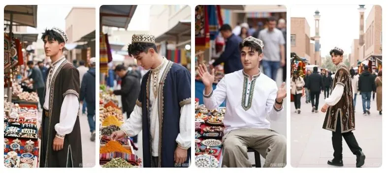 8K 画质,维吾尔族帅哥身着融入民族元素的日常穿搭,在新疆大巴扎的热闹场景中,利用集市的烟火气作为背景,自然光下的纪实风格,专业人像摄影,展现服饰在生活场景中的时尚感。要求:生成 4 张不同姿势、不同景别的高清图片,保持整体风格统一。细节呈现拉满,达到专业商业人像摄影级别,画面干净高级。