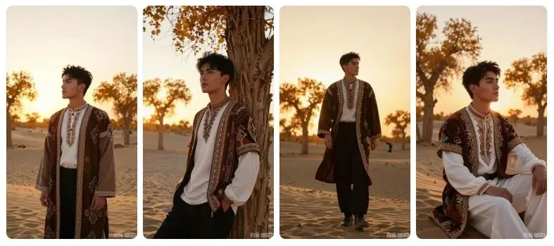8K 画质,维吾尔族帅哥穿着带有民族图案的户外风格服饰,在塔里木沙漠胡杨林中,黄昏的暖金色光线塑造硬朗轮廓,专业人像摄影,突出服饰与沙漠胡杨的质感对比。要求:生成 4 张不同姿势、不同景别的高清图片,保持整体风格统一。细节呈现拉满,达到专业商业人像摄影级别,画面干净高级。