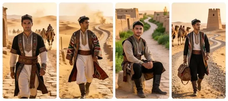 8K 画质,维吾尔族帅哥身着具有丝路风情的男士服饰,在模拟的丝路古道场景中,偏暖的光线营造历史感,专业人像摄影,体现服饰的丝路文化底蕴。要求:生成 4 张不同姿势、不同景别的高清图片,保持整体风格统一。细节呈现拉满,达到专业商业人像摄影级别,画面干净高级。