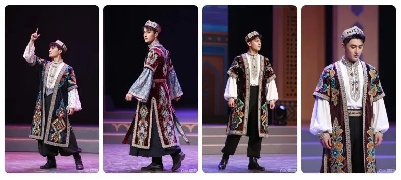 8K 画质,维吾尔族帅哥穿着华丽的舞台表演民族服饰,在具有民族特色的舞台上,专业的舞台灯光(侧光为主)突出服饰的舞台感,专业人像摄影,展现服饰的表演表现力。要求:生成 4 张不同姿势、不同景别的高清图片,保持整体风格统一。细节呈现拉满,达到专业商业人像摄影级别,画面干净高级。