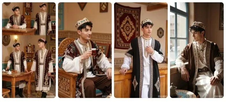 8K 画质,维吾尔族帅哥身着复古风格的民族服饰,在充满年代感的维吾尔族茶馆里,温暖的室内灯光营造复古氛围,专业人像摄影,展现服饰与复古场景的融合。要求:生成 4 张不同姿势、不同景别的高清图片,保持整体风格统一。细节呈现拉满,达到专业商业人像摄影级别,画面干净高级。