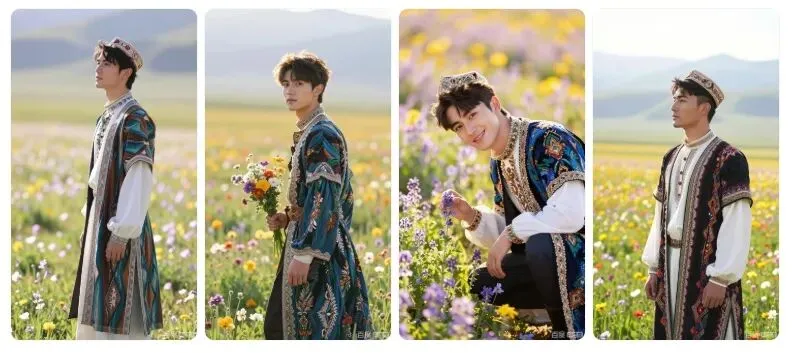8K 画质,维吾尔族帅哥穿着色彩搭配协调的民族风服饰,在伊犁花海中,柔和的自然光(逆光或侧逆光)让服饰与花海相得益彰,专业人像摄影,捕捉服饰在花海中的时尚之美。要求:生成 4 张不同姿势、不同景别的高清图片,保持整体风格统一。细节呈现拉满,达到专业商业人像摄影级别,画面干净高级。