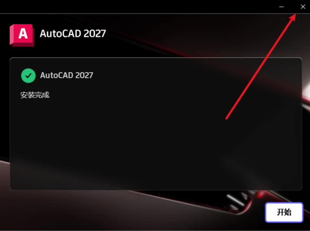 6.显示AutoCAD 2027安装完成,直接点击【X】关闭窗口。(不要点击【开始】)