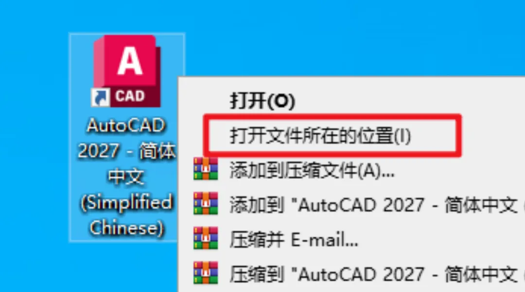 9.在电脑桌面,选中刚安装好的【CAD2027图标】,鼠标右键选择【打开文件所在位置】。