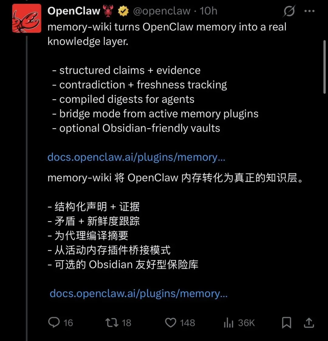 所以这次 memory-wiki 的意义,不是“又多了一个 memory 功能”。