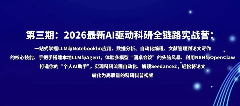 🌟 课程二:最新AI驱动科研全链路实战营:贯通LLM应用→数据分析→自动化编程→文献及知识管理→科研写作与绘图→构建本地LLM、Agent→多模型圆桌会议→N8N自动化工作流→OpenClaw个人AI助手→seedance2科研科普视频生成深度应用培训班