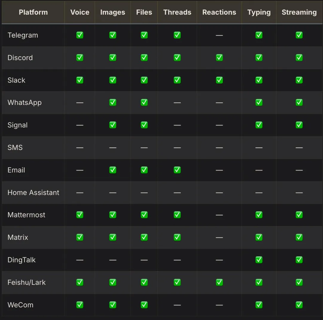 语音交互:CLI 里按 Ctrl+B 录音,Telegram / Discord 里可以直接语音对话,Discord 甚至能让 Agent 加入语音频道实时监听回话。支持本地 Whisper(免费)或 Groq 做语音识别,平时用不到但有需要时是个加分项。