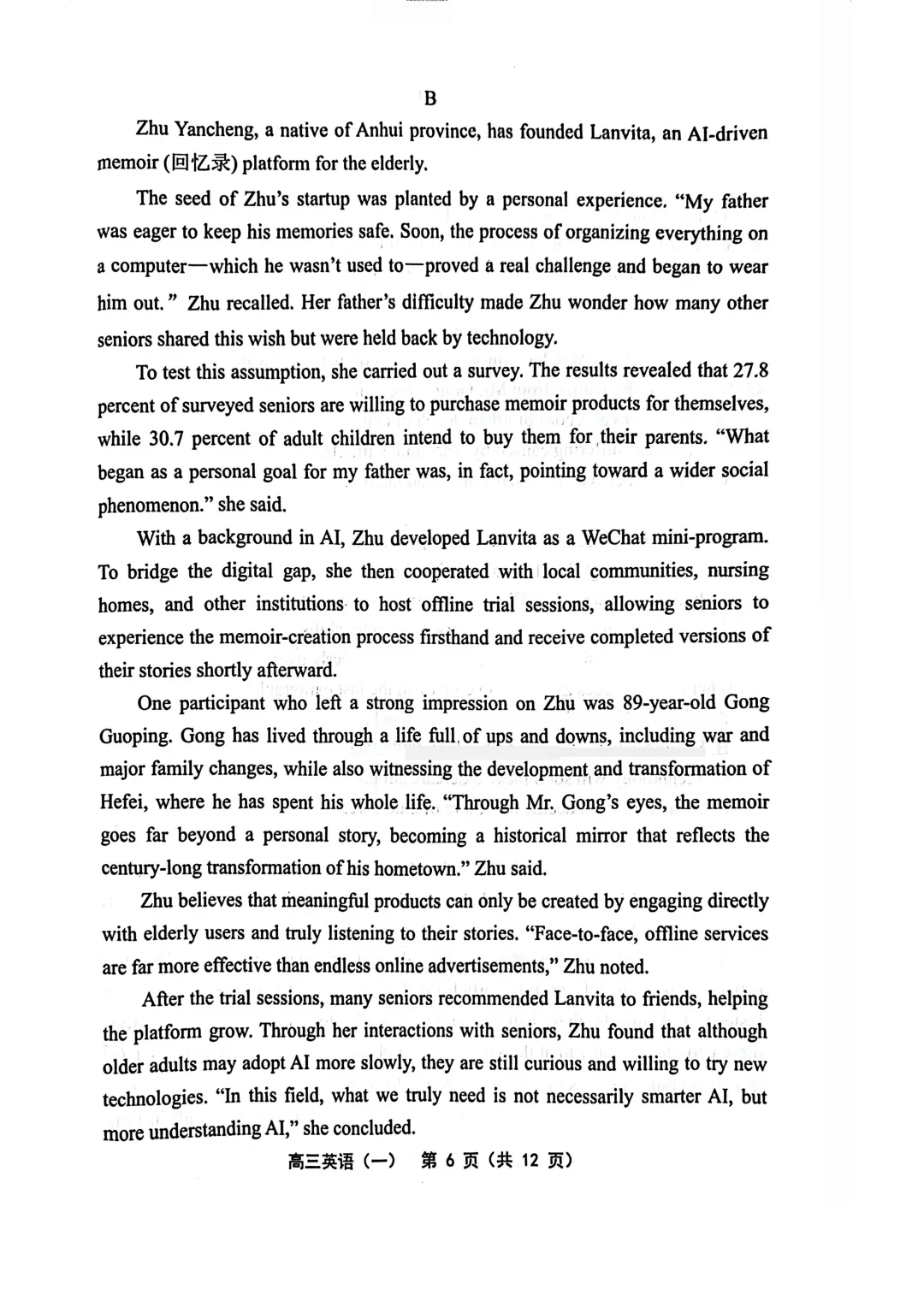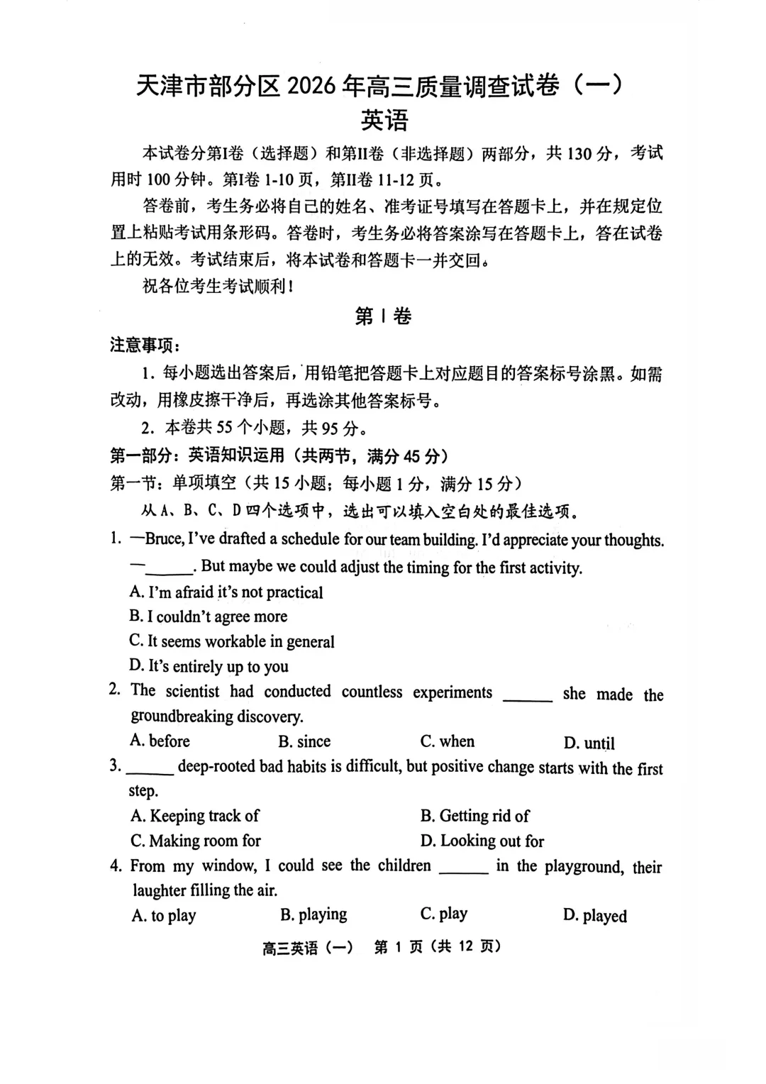 【可下载】天津市部分区2026年高三质量调查试卷(一)英语试题点击上方“蓝字”免费关注!本套试卷+答案解析下载入口关注“卿卿侃古今”公众号点击左下角阅读原文可下载相关链接:2007-2025年天津市高考英语真题汇总(持续更新中~)2011-2023年天津高考英语听力真题在线测试【高考英语听力在线测试】高考听力机考模拟试题大全(持续更新中)【可下载】2025-2026年高中英语试题汇总(附解析)【持续更新中】【汇总】高中英语月考和期中期末试题(持续更新中~)【题库】高一英语试题汇编(持续更新中~)【题库】高二英语试题汇编(持续更新中~)【题库】高三英语试题汇编(持续更新中~)【可下载】高三英语上学期期末试题16套(附解析)【可下载】高二英语上学期期末试题10套(附解析)【可下载】高一英语上学期期末试题汇9套(附解析)【可下载】2025-2026学年度高一高二高三开学考试模拟试卷(天津专用)(附解析)新外研版高中英语高清电子课本、课文原文和译文、单元同步复习资料和试题【持续更新中】【目录1】高中英语阅读理解限时训练大全(持续更新中~)【目录2】高中英语完形填空限时训练大全(持续更新中~)【目录3】高中英语书面表达大全(持续更新中~)【目录4】高中英语听力训练大全(持续更新中~)【目录5】高中英语单选题大全(持续更新中~)【目录6】高中英语语法题大全(持续更新中~)【目录7】高中英语阅读表达题大全(持续更新中~)【目录8】科普知识汇总【目录9】中高考学法知识汇总【目录10】高考英语真题+名校模拟真题+月考和期中期末试题(持续更新中~)【目录11】暑期高考英语备考资料大全持续更新中~【汇总】中高考志愿填报资料大全【汇总】高中英语月考和期中期末试题(持续更新中~)【汇总】2025届高三英语一模试题(附解析)【汇总】2024届高三英语一模二模三模试题(附解析)【汇总】2024届高考英语押题卷(附解析)【汇总】2025届高三英语周考综合练(附解析)【题库】高三英语限时训练(持续更新中~)【模拟】2025届高三英语听力机考模拟试题在线测试【高考词汇】(新)外研版高中英语全七册词汇表(附音频)【中考词汇】初中英语外研版必备单词表(完整版),可打印 建议收藏保存点击阅读原文查更多