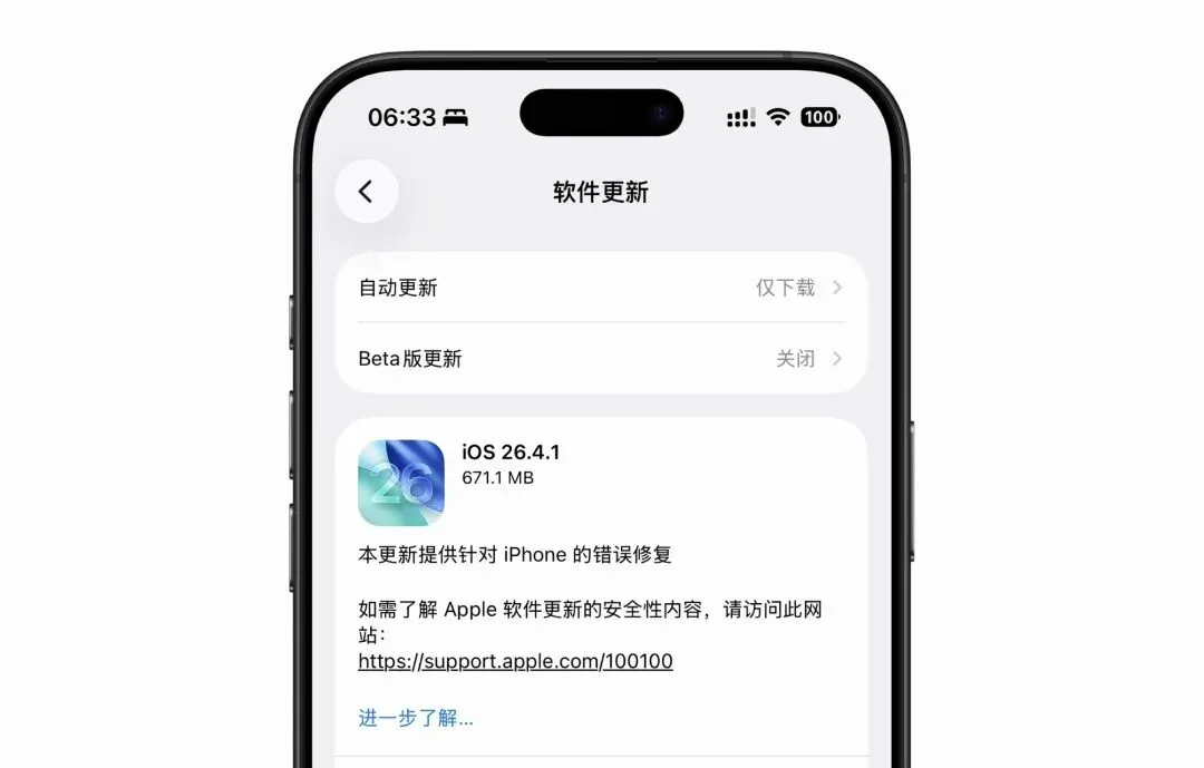 来了!真的来了!iOS26新系统已推送!昨天刚发布完iOS26.4.1要来了的消息后就有预感今天凌晨可能就会推送了,没想到打开软件更新一看,还真推送了,来的真及时。iOS26.4.1版本号为23E254,本次更新包大小仅为600多MB,所以也没有发现有肉眼可见的新增内容。苹果表示本更新提供针对iPhone 的错误修复,所以此版本主要还是以修复bug和提升系统稳定性为主,这也是小版本推送的主要目的。因此之前在iOS26.4正式版如果有遇到一些问题的用户,比如WiFi断流、iCloud同步等问题的或者觉得体验不怎么好的都可以选择更新到此版本。
