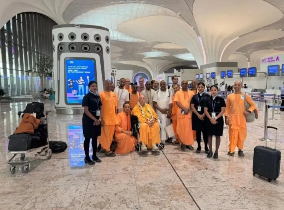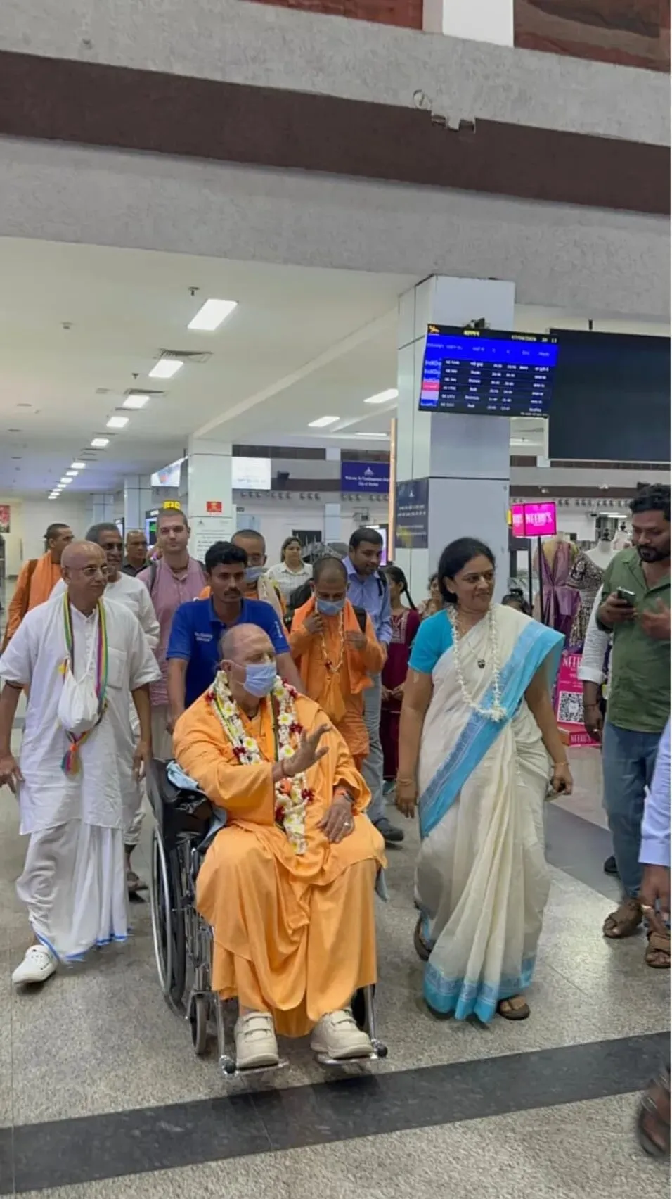 许多奉献者们在机场外等候。他们举着横幅、做着克依尔坦(kirtan)来欢迎我。我祝福了所有奉献者们,随后我们便启程前往曼迪尔。