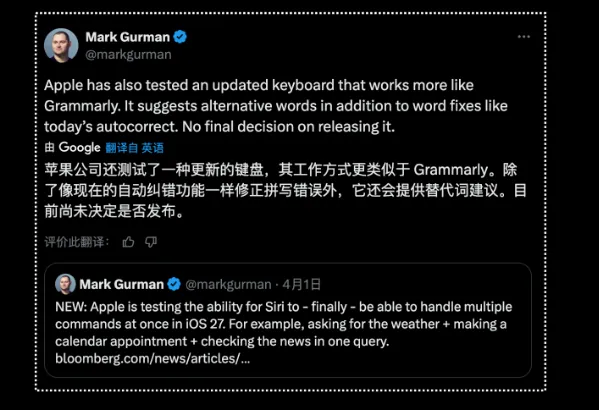 好消息是iOS或迎来键盘的大升级,根据彭博社 Mark Gurman 的消息:苹果正在测试一套升级版 iPhone 键盘,除了纠正错字外还可以提供联想和修改建议。