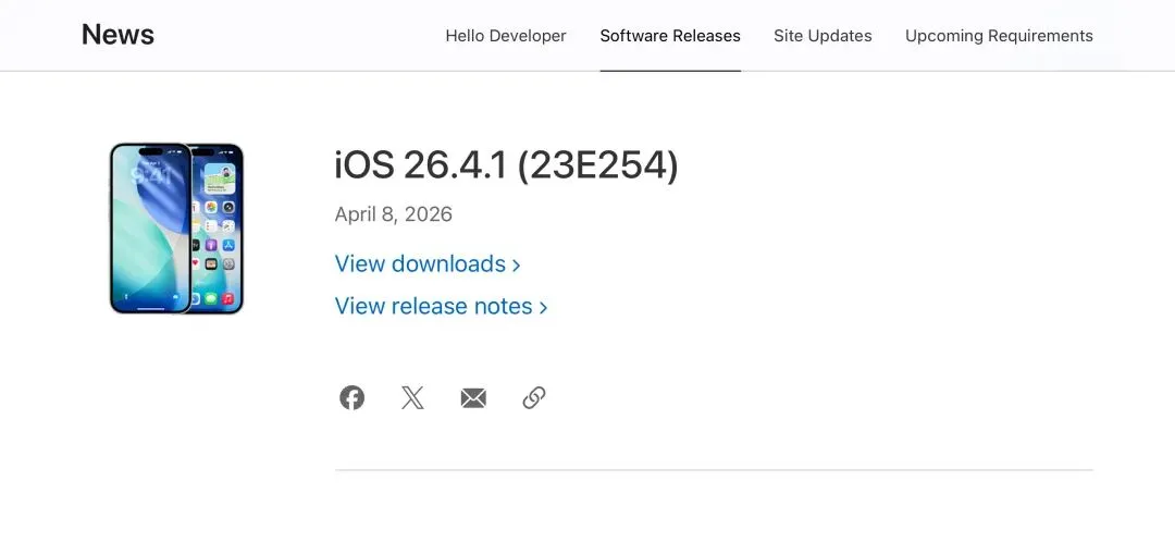 iOS 26.4.1 正式版更新,细节升级2026年4月9日,苹果正式向全球用户推送iOS/iPadOS 26.4.1正式版,属于紧急修复更新。
