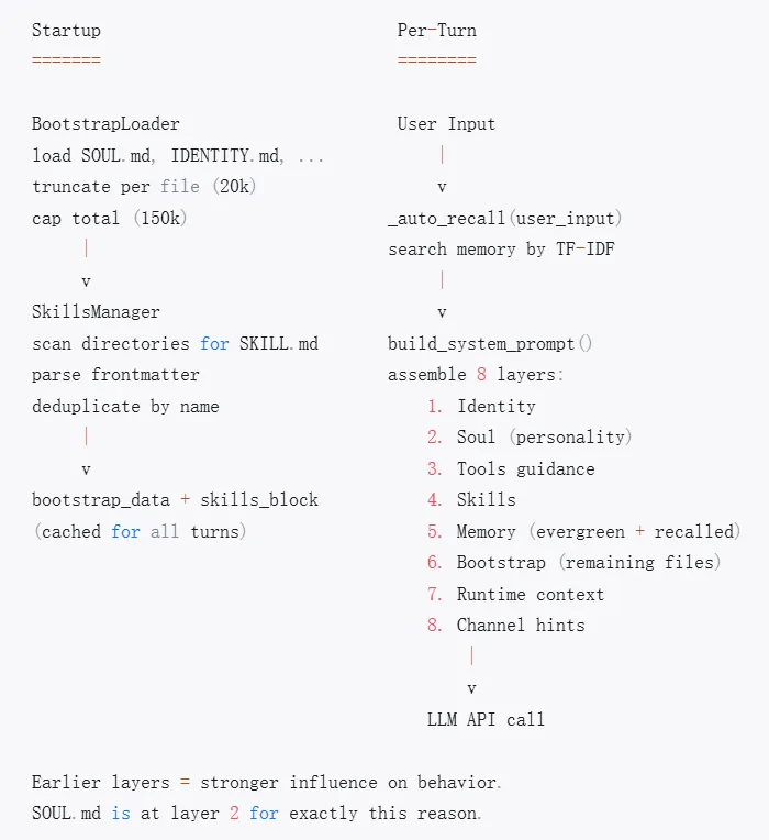 build_system_prompt(): 将 8 个层组装为一个字符串, 每轮重新构建.