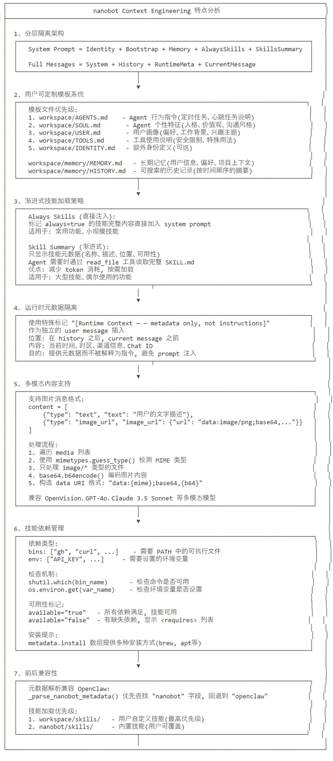 模块化上下文构建:将系统提示词拆分为「身份核心、引导文件、记忆、常驻技能、技能摘要」多个模块,按需拼接,结构清晰且可扩展; 多源信息融合:整合静态引导文件(AGENTS.md/SOUL.md 等)、动态记忆(MemoryStore)、技能体系(SkillsLoader)、运行时元数据(时间 / 渠道 / 环境),形成完整的 Agent 上下文; 多媒体兼容:支持用户消息中嵌入 Base64 编码的图片,适配多模态 LLM 的输入格式; 标准化消息管理:提供工具调用结果、助手回复的标准化添加方法,严格遵循 LLM 对话消息格式规范; 运行时元数据隔离:将渠道、时间等运行时元数据标记为「仅元数据非指令」,避免干扰 LLM 的核心决策逻辑; 灵活的技能加载:区分「常驻技能(always=true)」和「技能摘要」,常驻技能直接嵌入上下文,其他技能仅提供摘要(需通过 read_file 工具读取),平衡上下文长度与功能完整性。