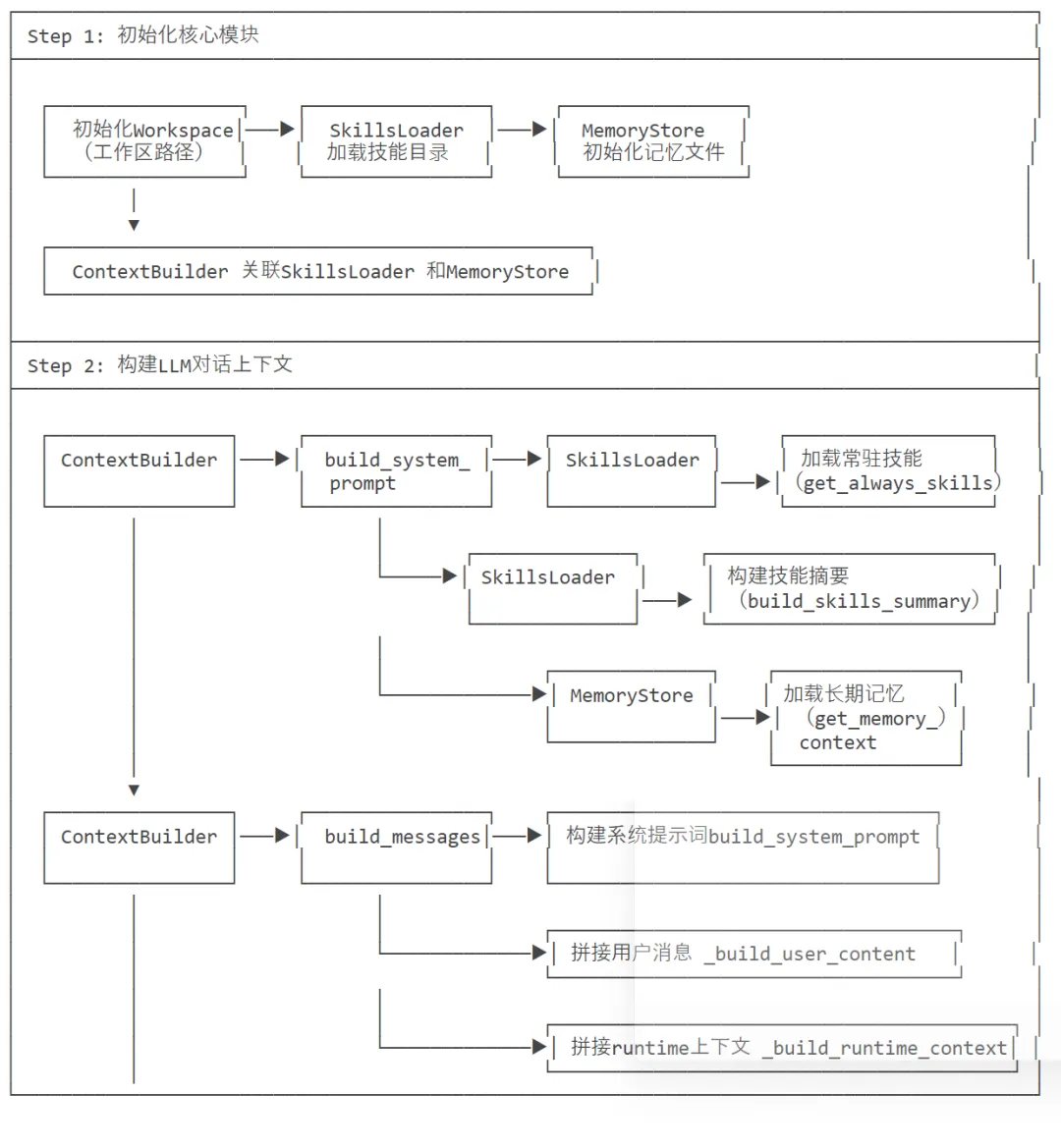 ContextBuilderskillsLoader↓ContextBuilder初始化(workspace) SkillsLoader(workspace) ← 创建实例↓build_system_prompt()→skills.get_always_skills() ← 获取常驻技能列表↓load_skills_for_context() ← 加载技能内容↓build_skills_summary() ← 构建技能摘要↓返回技能相关内容字符串
