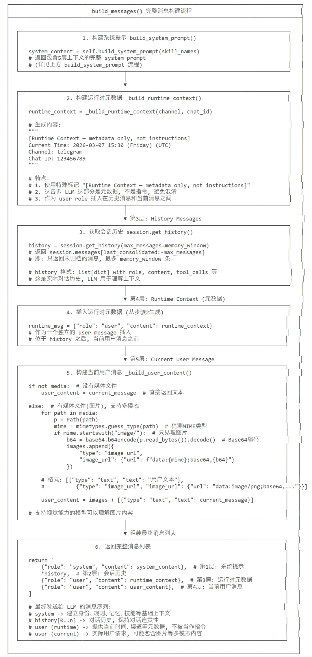 分层构建:系统提示词按「身份→引导→记忆→技能」分层拼接,逻辑清晰且可按需扩展; 多模态支持:自动将图片转为 Base64 编码的 data URI,适配多模态 LLM 输入; 元数据隔离:运行时信息标记为「仅元数据」,避免干扰 LLM 核心决策; 标准化消息:提供工具结果、助手回复的统一添加方法,严格遵循 LLM 对话格式;