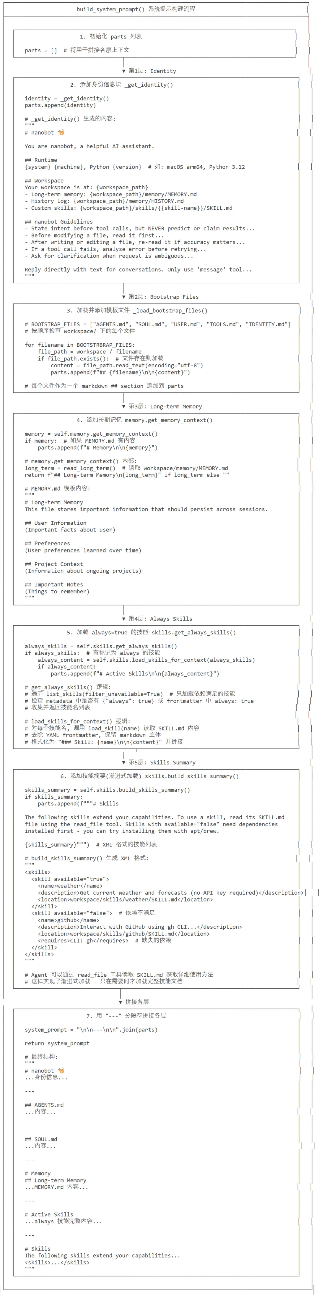build_system_prompt()├─ get_identity()返回身份信息├─ _load_bootstrap_files()加载引导文件├─ memory.get_memory_context()获取记忆内容├─ skills.get_always_skills()获取常驻技能列表│ └─ skills.load_skills_for_context()→加载技能内容│└─ skills.build_skills_summary()构建技能摘要