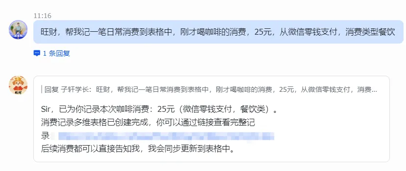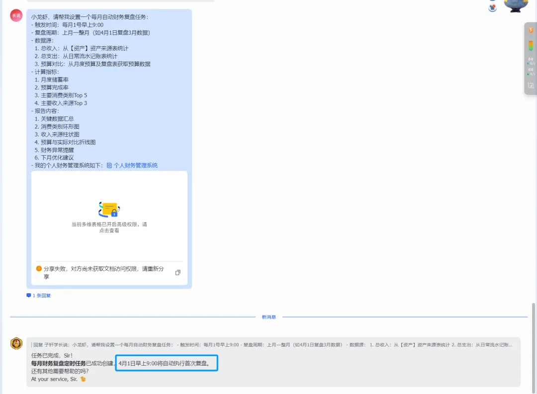 建议刚开始聊,指令具体一些,毕竟第一次它还不知道你的习惯,要具体到哪张子表的名称,甚至再具体一些登记什么信息。如果你的小龙虾接入语音能力了,那就更方便了,发语音条就可以了。