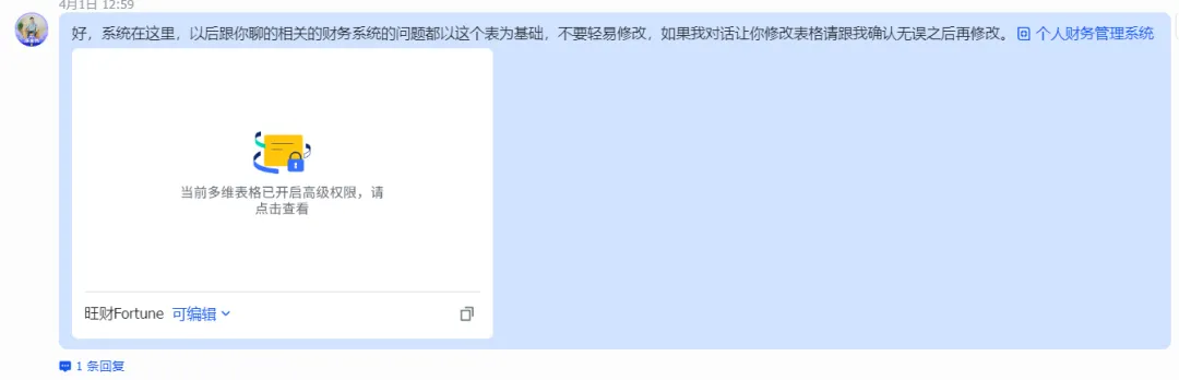然后在飞书里打开小龙虾,最核心的就是那套财务管理系统,丢给它让它管理就好。以前可能你还要手动记录的多,现在都可以交给它了。