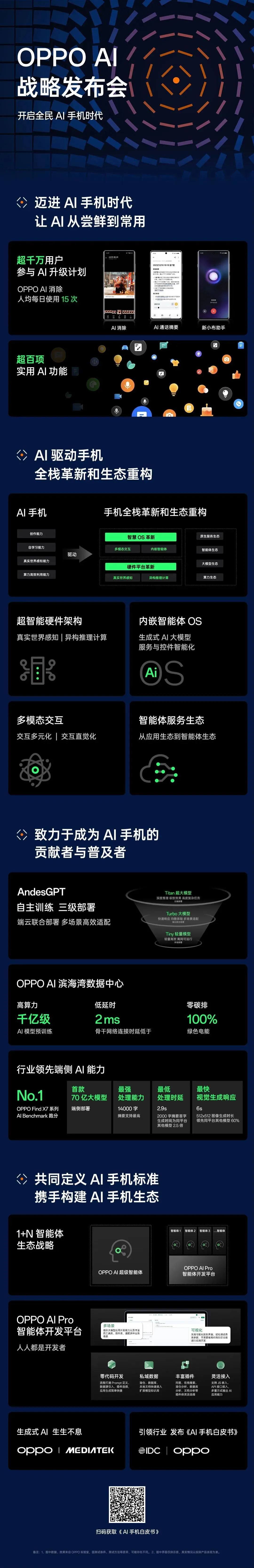 早在2020年,OPPO就推出了首个AI大模型,超前进行AI布局,并且不断进行投入,又于不久前推出了行业首个端侧部署70亿参数大模型;在云端算力上持续投入,拥有能够支持千亿级AI模型训练的高算力的OPPO AI滨海湾数据中心,持续扩大绿色算力,并自主训练安第斯大模型。同时,OPPO还联合相关部门和组织推进AI手机行业标准建设,加快建立智能体生态体系……