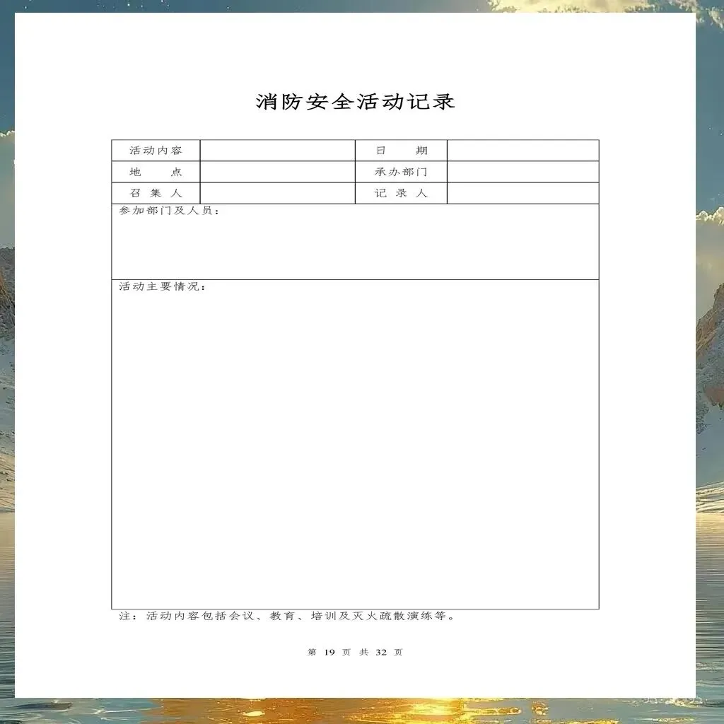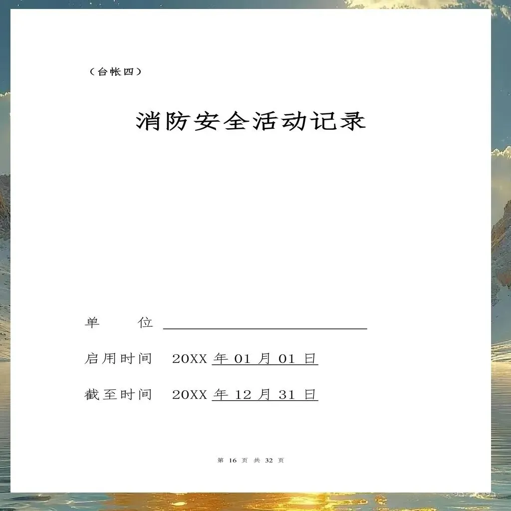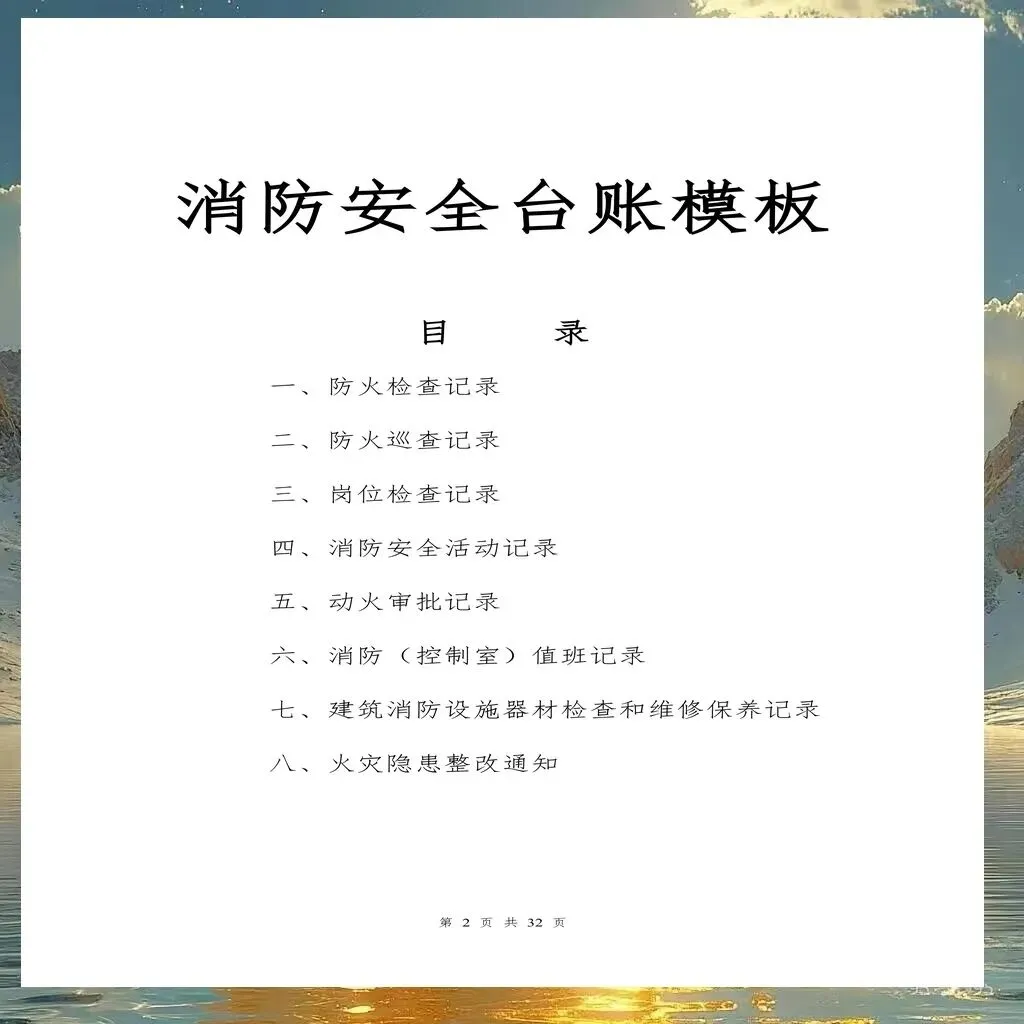 消防安全台账一般分为以下类别:消防安全基本情况类、消防安全管理制度类、消防设施器材类、消防安全检查类、消防安全培训类、火灾隐患整改类、灭火和应急疏散预案类、消防工作记录类。每类台账应设置目录页,便于查阅和管理。