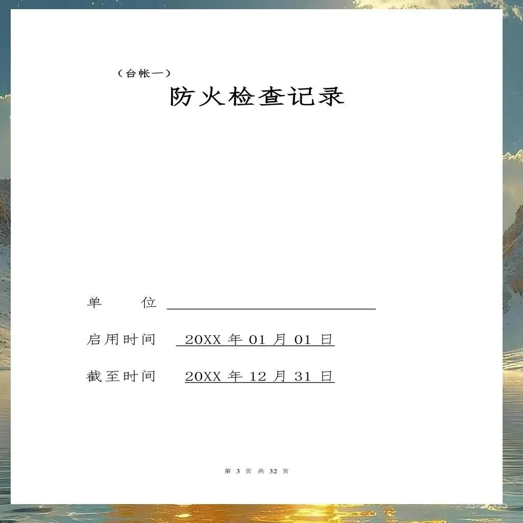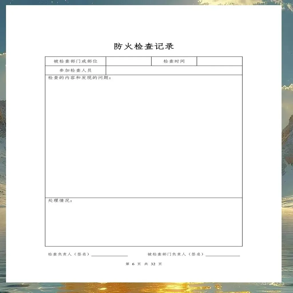 防火检查记录一般每月进行一次。记录内容包括检查时间、部门、检查内容、发现的问题、整改措施、检查人签字、被检查部门负责人签字。检查内容应全面覆盖消防安全管理制度落实情况。