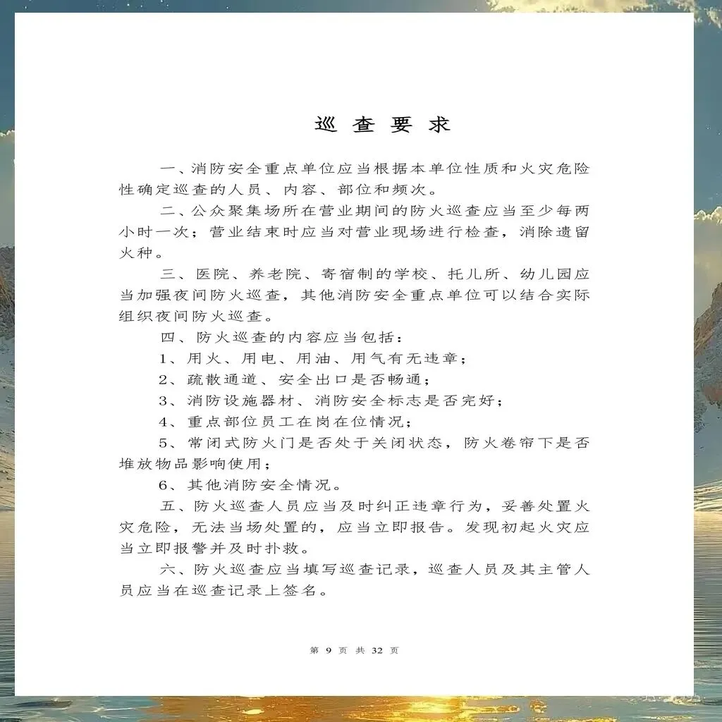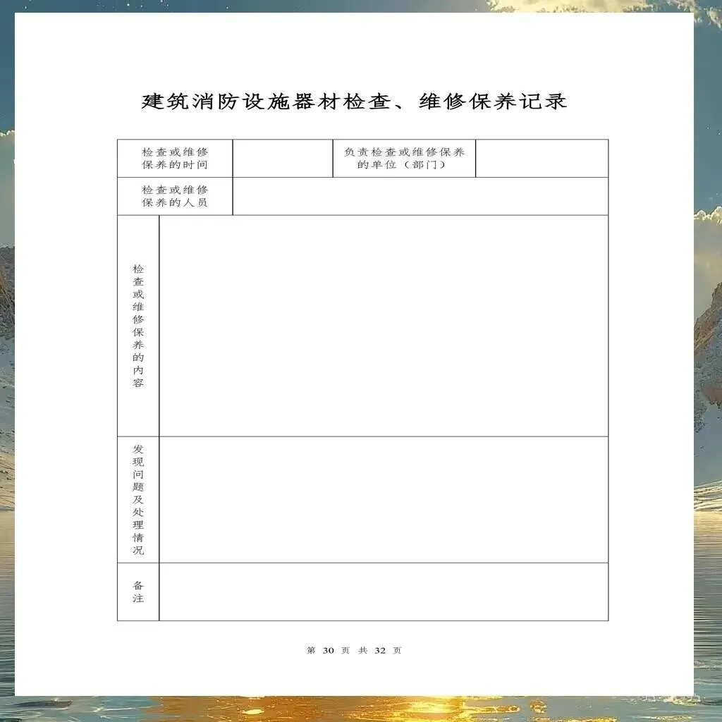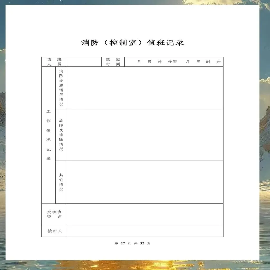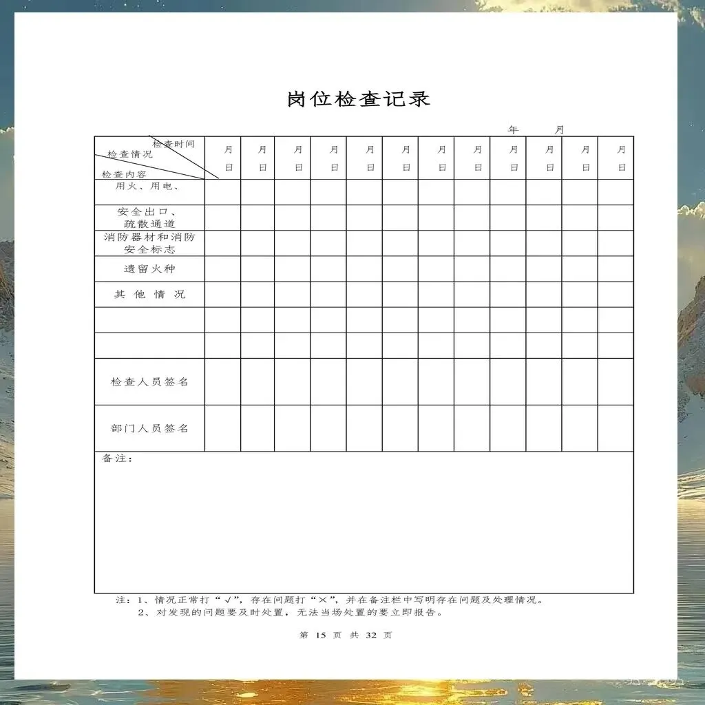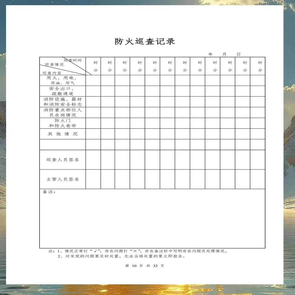 防火巡查记录适用于消防安全重点单位,每日进行巡查。记录内容包括巡查时间、部位、发现的问题、处理情况、巡查人签字。巡查范围包括用火用电、安全出口、疏散通道、消防设施、消防安全标志等。