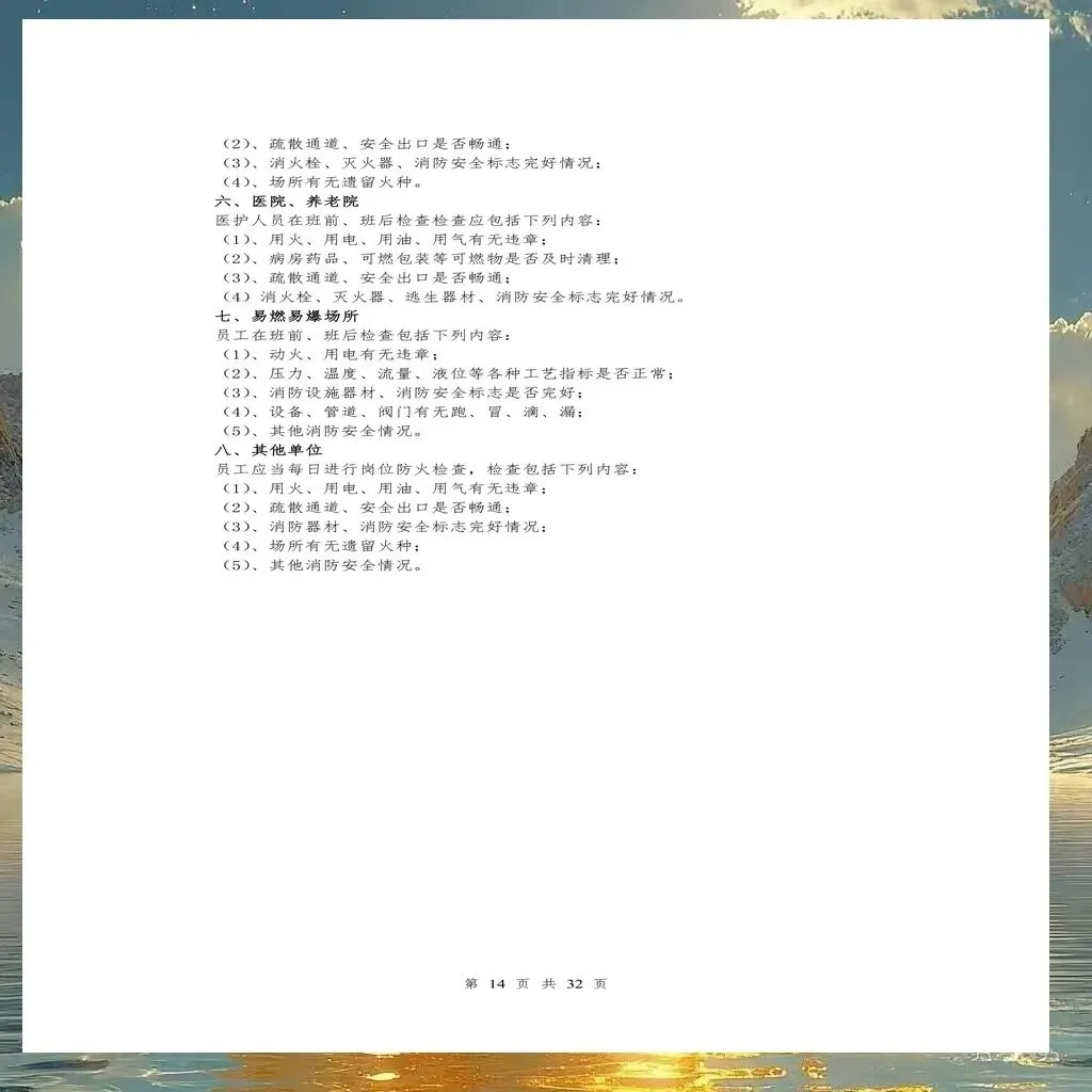 操作规程包括:消防设施操作规程。消防安全重点部位操作规程。电气设备操作规程。动火作业操作规程。各岗位操作规程应张贴于相应岗位,便于查阅执行。