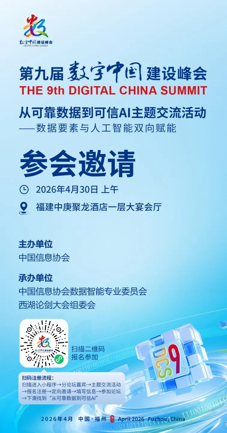 从可靠数据到可信AI主题交流作为第九届数字中国建设峰会的重要组成部分,将于4月30日上午在福建省福州市中庚聚龙酒店一层大宴会厅举行。