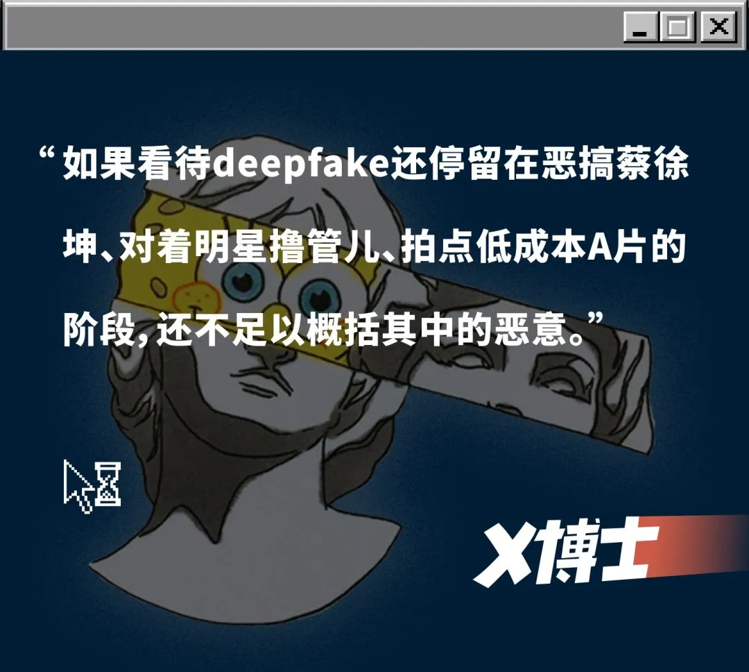 如果看待deepfake还停留在恶搞蔡徐坤、对着明星撸管儿、拍点低成本A片的阶段,还不足以概括其中的恶意。