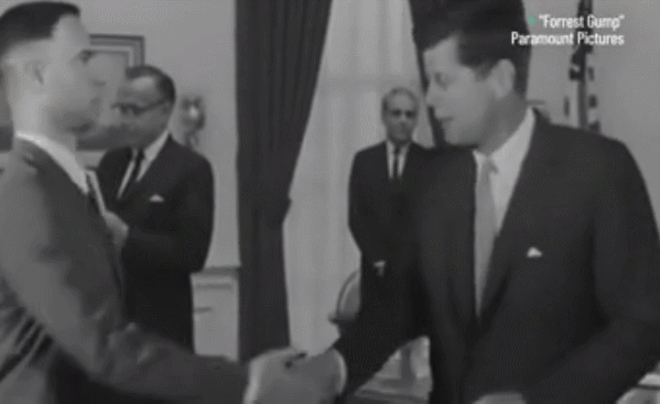 换脸技术运用最广泛的领域就是电影,比方说1994年的《阿甘正传》就用了“原始”的换脸技术,用数字方式,将肯尼迪的影像填充到了电影中,并调节他的表情和肢体语言。