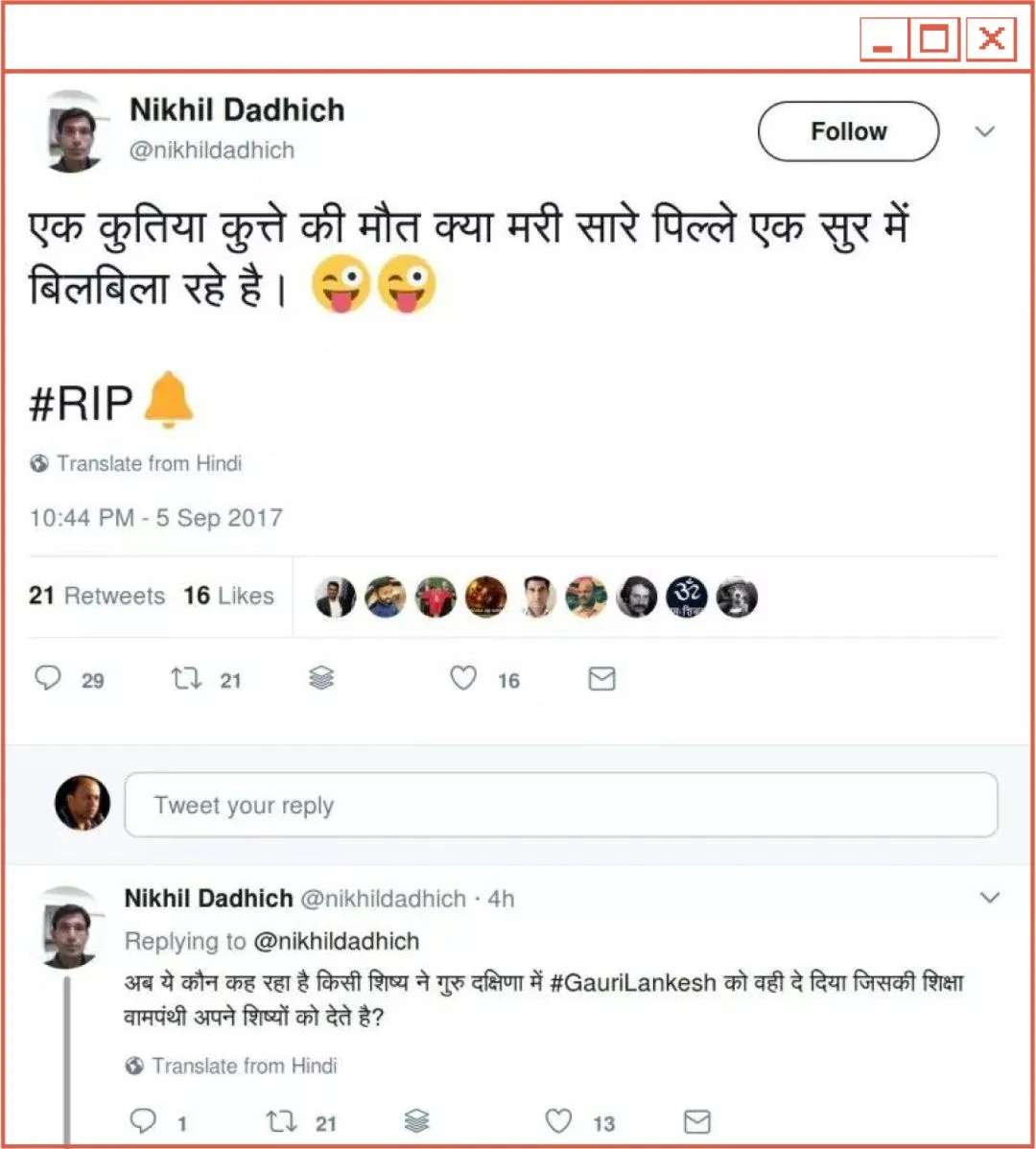 印度记者Rana Ayyub,因为揭露了印度古吉拉特暴乱中官员的黑幕和不作为。她不仅收到了死亡威胁,她也被色情复仇了。