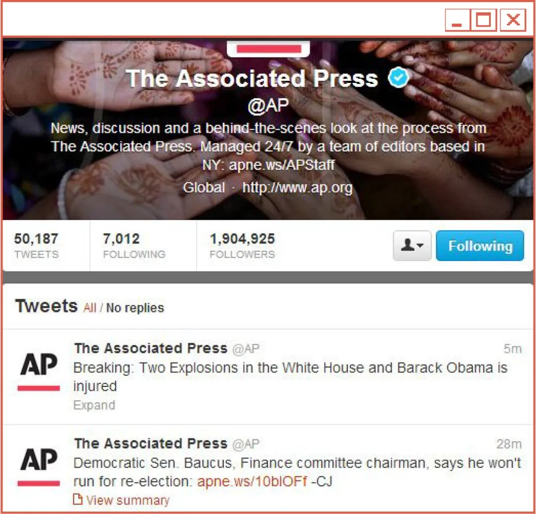 你可能会质疑,市场有这么蠢么?抱歉,这就是事实。2013年4月23日,美联社的推特账号被黑客攻击,发布了一条假新闻,说:“号外:白宫发生两次爆炸,奥巴马受伤”。