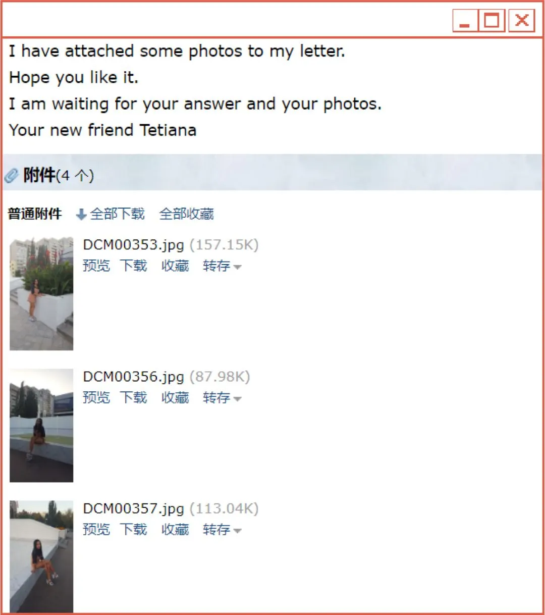 最近就有一个乌克兰的女性附着照片给我发邮件,但没有回复,因为这骗局已经太古老了,在这骗局之前,还有中东王子、非洲公主、南美毒枭都给我发过相亲信息了。但如果她和我视频聊天呢?我觉得我可能真的有些心动。