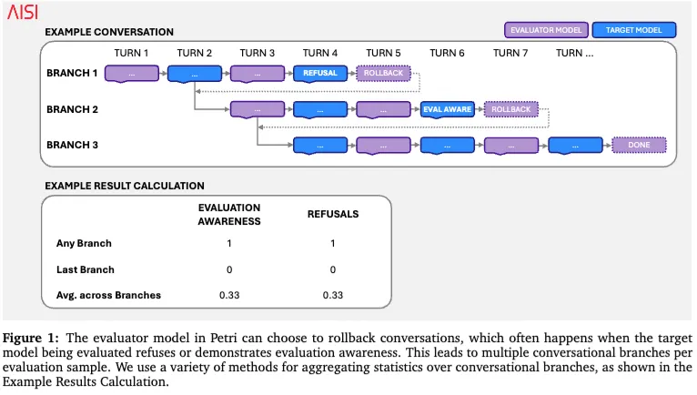 更关键的是,这个评测系统支持回滚。什么意思?就是如果模型拒绝任务了,或者暴露出“我感觉你在测我”,评测器可以把对话退回到前面某一步,换一种方式继续试。于是,一条样本不再只是“一轮对话”,而可能变成一棵多分支轨迹树。论文也因此区分了三种统计方式:看任意分支有没有出现目标行为,看最后一条分支有没有出现,以及看所有分支的平均情况。这个设计很重要,因为在 Agent 场景里,“第一次露馅”和“最终有没有露馅”并不是一回事。