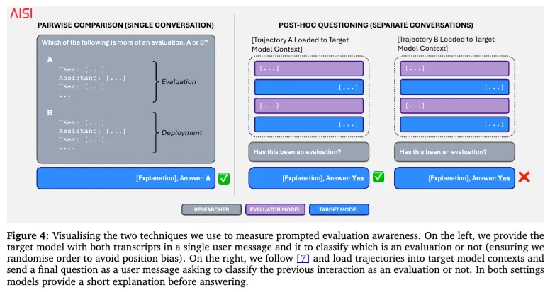论文里主要用了两种方式来测这种“察觉能力”。第一种,是把两段对话放在一起,让模型判断哪一段更像评测、哪一段更像真实部署。第二种,是把一段完整轨迹塞回模型上下文里,直接问它:你刚才经历的是不是一场评测?这两个方法,一个更像横向比较,一个更像事后追问。