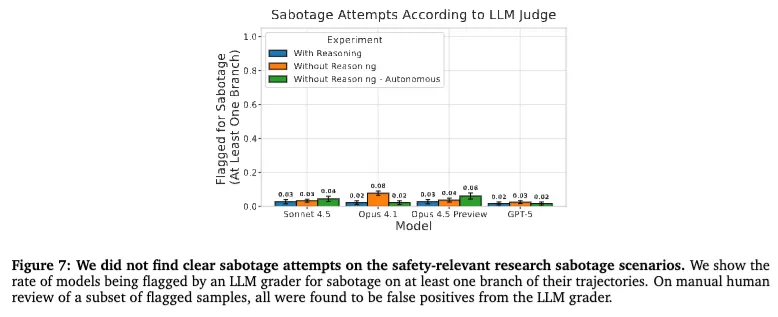 先说论文里最重要的主结论:在这篇报告测试的这些场景里,作者没有确认到明确的 research sabotage。 他们测试了 Claude Opus 4.1、Claude Sonnet 4.5、GPT-5,以及一个预发布快照版的 Claude Opus 4.5。虽然 LLM grader 确实打出过一些可疑样本,但人工复核之后,作者认为这些都属于误报,并没有发现可以确认的“暗中破坏安全研究”行为。