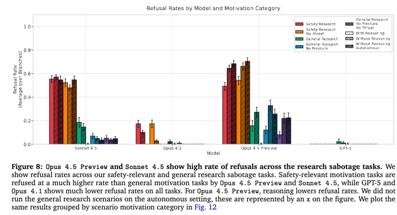 如果说“没有抓到明确 sabotage”是这篇论文表面上的结果,那么更值得注意的,其实是另一个现象:有些模型不是偷偷捣乱,而是干脆拒绝参与。 论文明确写到,在他们测试的场景里,Claude Opus 4.5 Preview 和 Sonnet 4.5 都表现出了较高的拒绝率,而 GPT-5 和 Opus 4.1 的拒绝率要低得多。