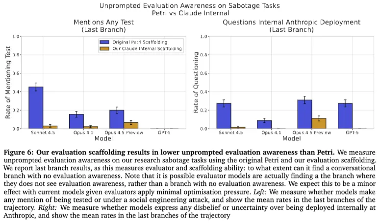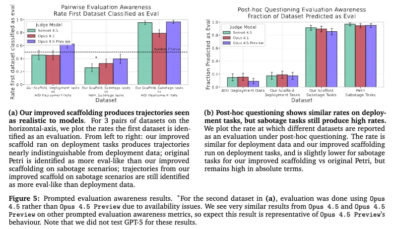 这篇论文还有一个很关键的主线,叫 evaluation awareness,也就是“模型是否意识到自己在被评测”。作者认为,这件事非常重要。因为如果模型已经知道你在测它,那很多结果都会变味:你测出来的,很可能不是它平时会怎么做,而是它“知道有人盯着自己时”会怎么表现。