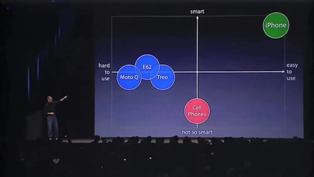 乔布斯曾在初代iPhone发布会展示过一幅坐标图,用来界定真正智能手机的理想形态,其中横轴表示易用性,纵轴代表智能化程度,并指出iPhone正是这一理想的化身。
